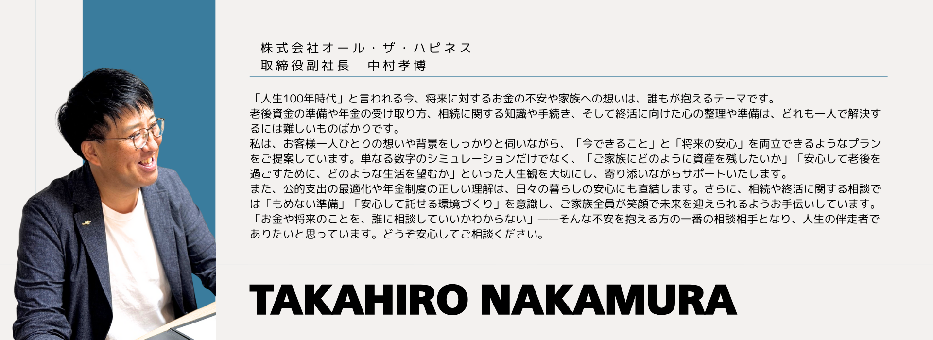 また、公的支出の最適化や年金制度の正しい理解は、日々の暮らしの安心にも直結します。さらに、相続や終活に関する相談では「もめない準備」「安心して託せる環境づくり」を意識し、ご家族全員が笑顔で未来を迎えられるようお手伝いしています。